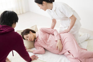 分娩が近い時期に生活などで注意することや病院への連絡のタイミング、また、陣痛中の腰のさすり方などについて助産師が丁寧に説明を行います。