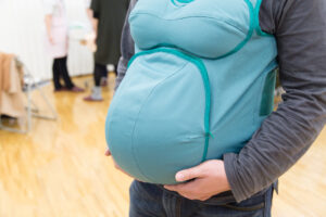 妊婦体験ジャケットをご主人さんに着ていただき、妊婦さんのおなかの重さや足元の見えにくさを体験していただきます。