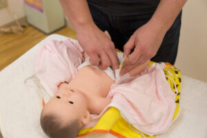 沐浴人形を用いて、助産師と一緒に沐浴の練習をします。